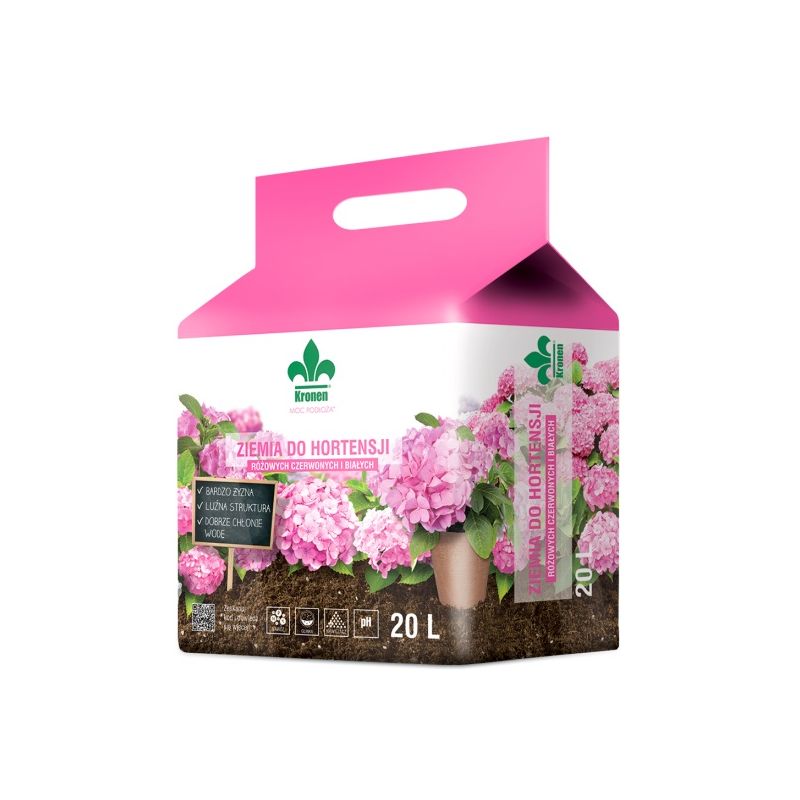 KRONEN® Ziemia do hortensji różowych, czerwonych i białych jest przeznaczona do sadzenia i przesadzania hortensji uprawianych w domach, na balkonach, tarasach i w ogrodach. Zawiera wieloskładnikowy nawóz z mikroelementami całkowicie rozpuszczalny w wodzie i łatwo przyswajalny przez system korzeniowy rośliny. KRONEN® Ziemia do hortensji różowych, czerwonych i białych to bogate w próchnicę, żyzne, naturalne podłoże. Wyprodukowane w oparciu o frakcje torfu wysokiego z dodatkiem glinki i nawilżacza.