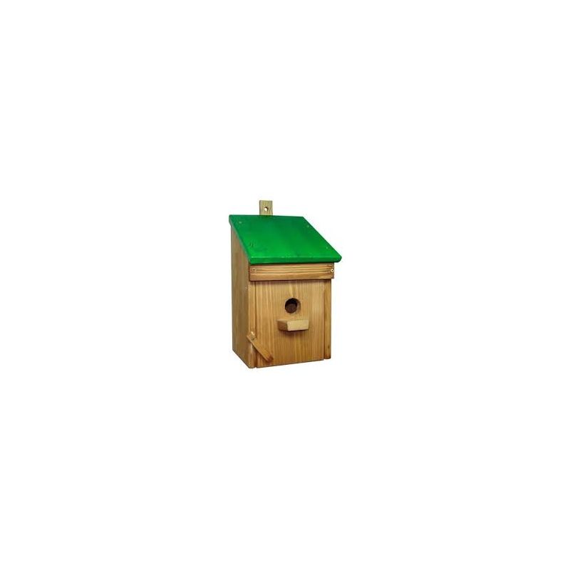 Budka lęgowa pokryta jest impregnatem z dodatkiem lakieru matowego. Wykonana w całości z litego drewna iglastego. Na tyle zamontowano zawieszkę do mocowania na ścianie lub drzewie. Budka lęgowa posiada otwieraną klapkę by można ją było wyczyścić po wiosennych lęgach.