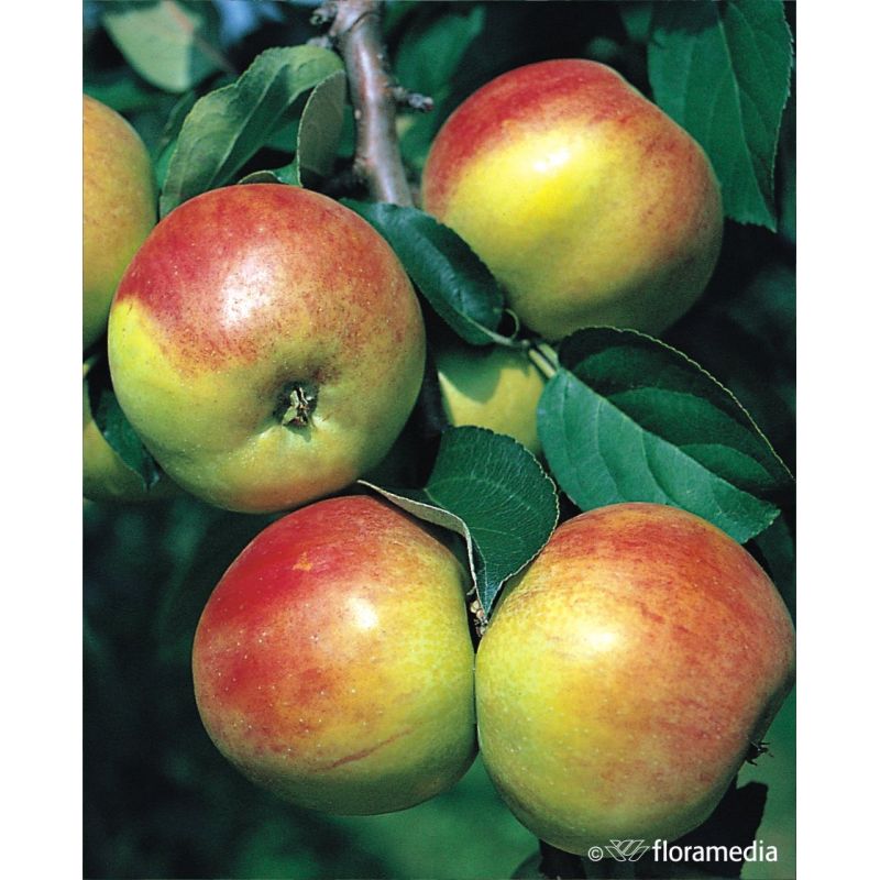 Odmiana o silnym wzroście, korona szeroka, kulista. Owoce średniej wielkości, kuliste, nieco spłaszczone, żebrowane. Skórka koloru żółtego pokryta prążkowanym, ciemnoczerwonym rumieńcem. Miąższ biały, nieco zielonkawy, soczysty, słodko-winkowaty.
