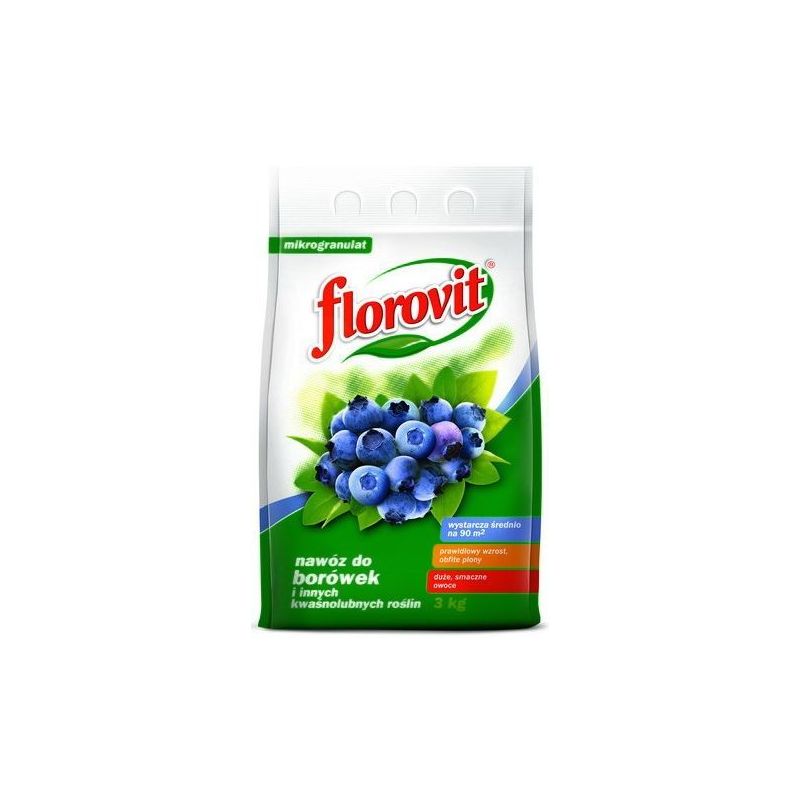 Wieloskładnikowy, mineralny nawóz doglebowy, przeznaczony do pogłównego dokarmiania borówek w pierwszym roku po posadzeniu i w dalszych latach uprawy. Ważną zaletą Florovitu do borówek jest zdolność zakwaszania gleby, co wyraźnie sprzyja wzrostowi i rozwojowi roślin wymagających stanowiska o niskim odczynie podłoża. Cechuje go również brak azotanów. Borówki sadzi się jesienią w podłoże o pH 3,8 - 4,8. Rośliny uprawiane w podłożu o zbyt wysokim odczynie charakteryzują się małymi przyrostami oraz przedwczesnym żółknięciem i opadaniem liści. Nawóz zapobiega chlorozie liści w okresie wegetacji roślin. Ponadto zastosowano w nim słabo przemieszczające się w glebie formy składników pokarmowych, co zabezpiecza je przed wymywaniem do wód gruntowych.